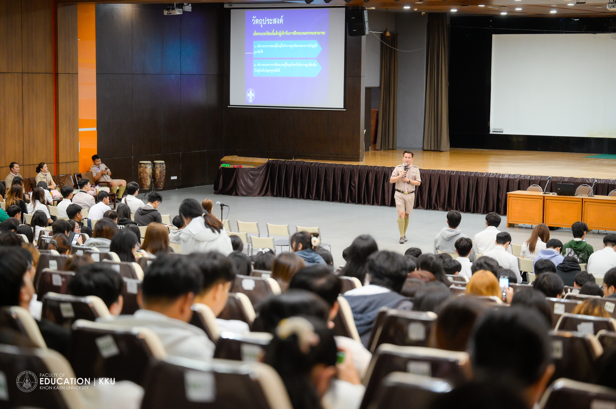 รศ.ดร.วายุ กาญจนศร รองคณบดีฝ่ายพัฒนานักศึกษาและองค์กรสัมพันธ์ ผู้กล่าวรายงานวัตถุประสงค์ของการจัดฝึกอบรม ได้กล่าวว่า การฝึกอบรมนี้มีเป้าหมายสำคัญเพื่อให้ผู้เข้ารับการอบรมมีความรู้ ความเข้าใจ และทักษะลูกเสือตามแนวทางแผนใหม่ พัฒนาบุคลากรด้านการลูกเสือให้มีศักยภาพและคุณวุฒิสูงขึ้น อีกทั้งเป็นการสืบทอดเจตนารมณ์ทางการลูกเสือให้เจริญก้าวหน้า สอดคล้องกับประกาศกระทรวงศึกษาธิการ เรื่องมาตรฐานคุณวุฒิระดับปริญญาตรี สาขาครุศาสตร์และสาขาศึกษาศาสตร์ (หลักสูตร 4 ปี) โดยรูปแบบการฝึกอบรมเน้นการผสมผสานระหว่างทฤษฎีและการปฏิบัติ เพื่อให้ผู้เข้ารับการอบรมสามารถนำไปประยุกต์ใช้ได้จริง และขอบคุณสโมสรลูกเสือจังหวัดขอนแก่น ที่ได้ส่งบุคลากรที่มีความเชี่ยวชาญมาร่วมเป็นวิทยากรในการฝึกอบรมครั้งนี้