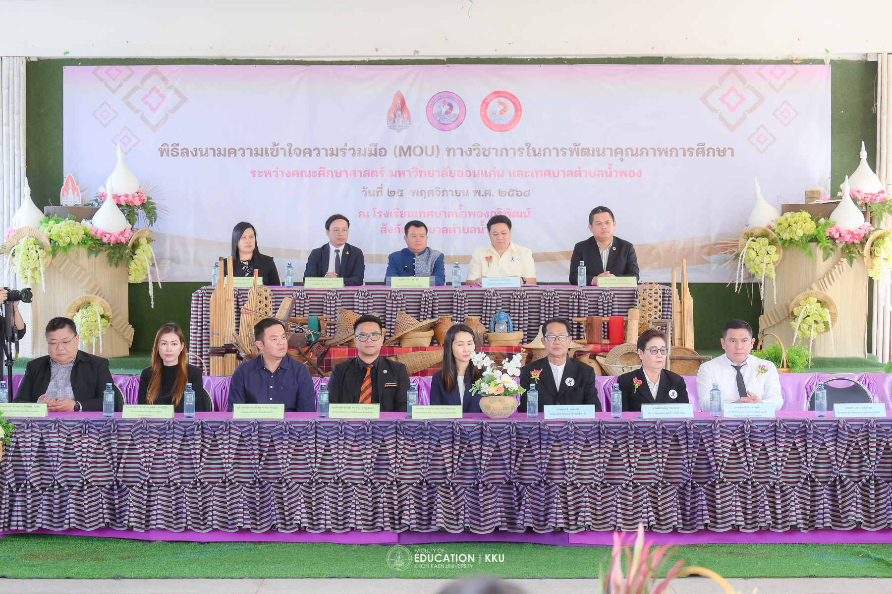 25 พฤศจิกายน 2568 – คณะศึกษาศาสตร์ มหาวิทยาลัยขอนแก่น และ เทศบาทตำบลน้ำพอง ได้จัดพิธีลงนามบันทึกข้อตกลงความร่วมมือทางวิชาการ (MOU) ณ โรงเรียนเทศบาลน้ำพองภูริพัฒน์ การลงนามครั้งนี้มีเป้าหมายเพื่อร่วมกันขับเคลื่อนและยกระดับคุณภาพการศึกษาของโรงเรียนเทศบาลน้ำพองภูริพัฒน์ โดยนำนวัตกรรมการศึกษาและหลักสูตรจาก โรงเรียนสาธิตมหาวิทยาลัยขอนแก่น มาประยุกต์ใช้เพื่อพัฒนาผู้เรียนและครูผู้สอนให้ก้าวทันต่อการเปลี่ยนแปลงของโลกยุคปัจจุบัน พิธีลงนามได้รับเกียรติจาก รศ.ดร.อิศรา ก้านจักร คณบดีคณะศึกษาศาสตร์ มหาวิทยาลัยขอนแก่น พร้อมด้วยคณะผู้บริหารเข้าร่วม โดยมี นายคัคเนศ คงเจริญสุข นายกเทศมนตรีตำบลน้ำพอง เป็นประธานในพิธี และกล่าวรายงานโดย นายเทพนคร นามวงษ์ ผู้อำนวยการโรงเรียนเทศบาลน้ำพองภูริพัฒน์ พร้อมทั้งมีผู้ร่วมลงนามเป็นสักขีพยาน อาทิ ผศ.ดร.ศิริศักดิ์ เหล่าจันขาม คณบดีวิทยาลัยการปกครองท้องถิ่น มหาวิทยาลัยขอนแก่น