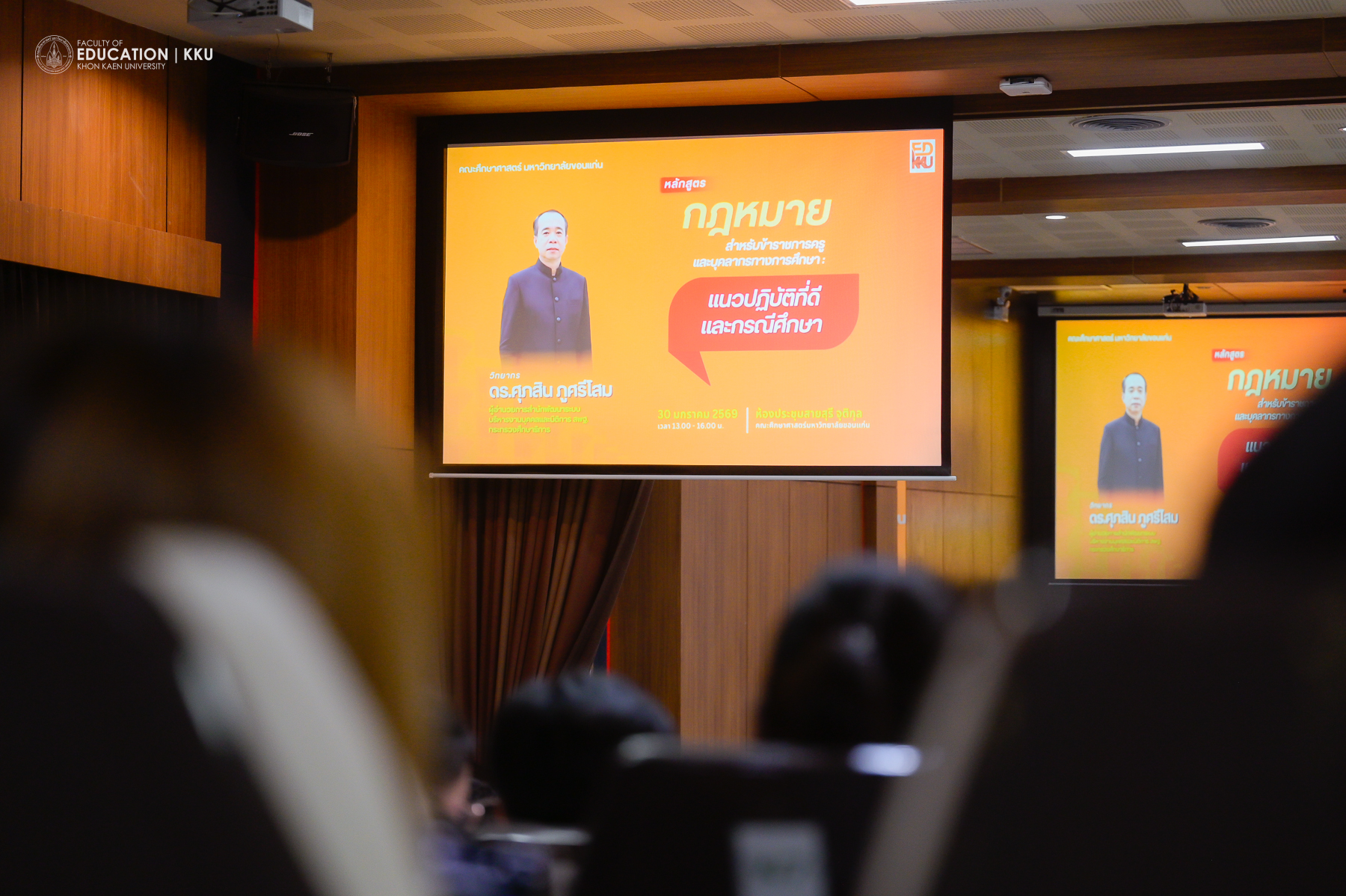 30 มกราคม 2569 ณ ห้องประชุมสายสุรี จุติกุล คณะศึกษาศาสตร์ มหาวิทยาลัยขอนแก่น ได้จัดโครงการอบรมเชิงวิชาการเรื่อง “กฎหมายสำหรับข้าราชครูและบุคลากรทางการศึกษา : แนวปฏิบัติที่ดีและกรณีศึกษา” เพื่อสร้างความเข้าใจในการปฏิบัติงานตามหลักนิติธรรม โดยมี รศ.ดร.อิศรา ก้านจักร คณบดีคณะศึกษาศาสตร์ เป็นประธานในพิธีเปิด และ รศ.ดร.วายุ กาญจนศร รองคณบดีฝ่ายกิจการนักศึกษาและสังคมยั่งยืน เป็นผู้กล่าวรายงาน ท่ามกลางผู้เข้าร่วมรับฟังกว่า 339 คน ทั้งผู้บริหาร ครู บุคลากร และนักศึกษา