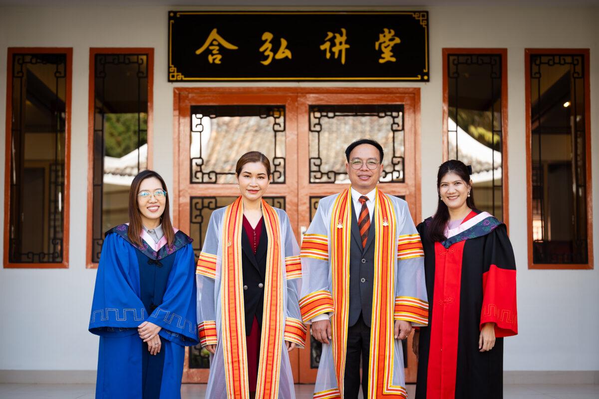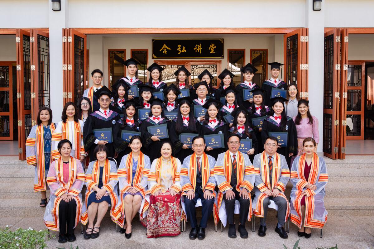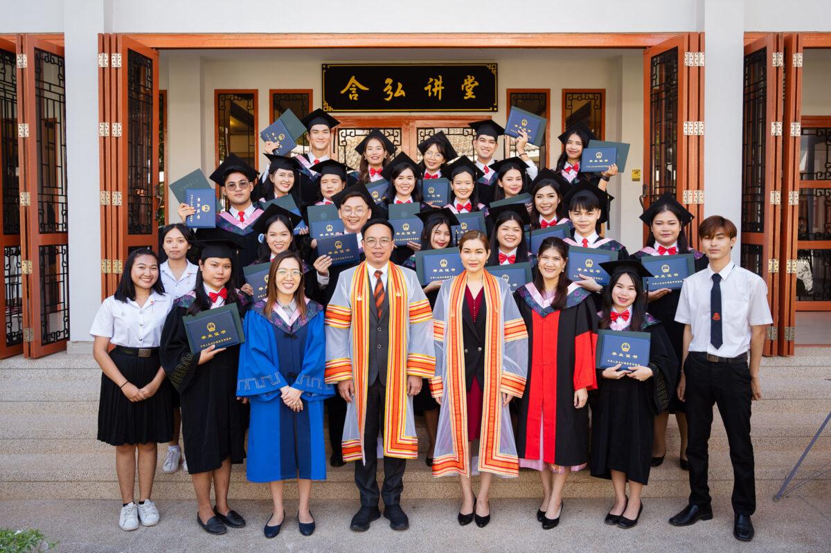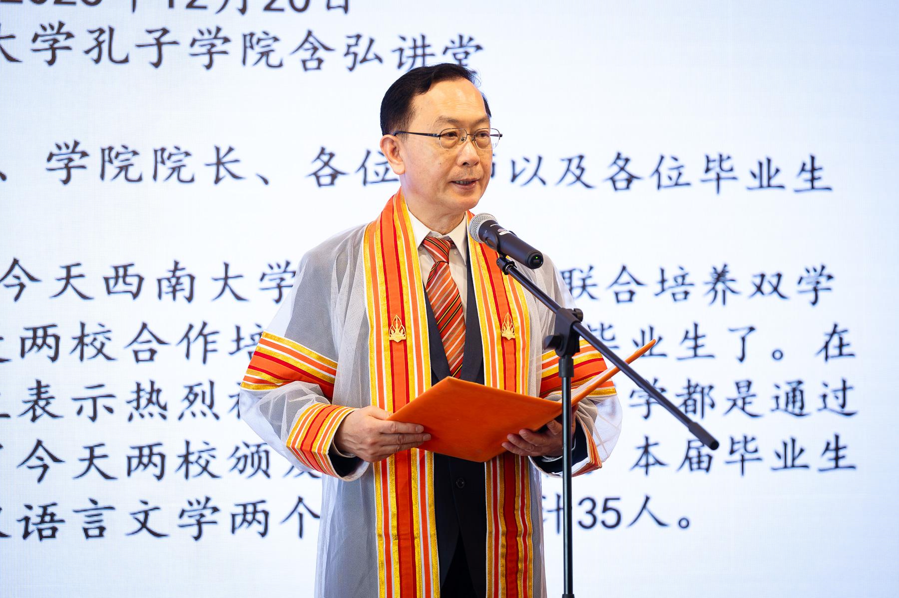 รศ.นพ.ชาญชัย พานทองวิริยะกุล กล่าวว่า “บัณฑิตทุกท่าน ถือได้ว่าเป็นผู้ที่ประสบความสำเร็จในเชิงวิชาการและวัฒนธรรม เนื่องจากมีโอกาสได้รับการศึกษาจากทั้งในประเทศไทยและประเทศจีน ซึ่งประเทศจีนเป็นประเทศที่รุ่งเรืองด้วยภูมิปัญญาและมีอารยธรรม โดยบัณฑิตนั้นได้มีโอกาสเรียนภาษากับเจ้าของภาษาโดยตรง ได้การเรียนรู้วัฒนธรรมจีนที่หลากหลายจากสภาพแวดล้อมจริง อีกทั้งยังได้สัมผัสถึงวิถีการดำรงชีวิตของชาวจีน จึงทำให้บัณฑิตมีความพร้อมทั้งด้านความรู้และประสบการณ์ หวังเป็นอย่างยิ่งว่าบัณฑิตจะได้นำความรู้และประสบการณ์ที่ได้รับมาใช้ให้เกิดประโยชน์ต่อการทำงานหรือการศึกษาต่อในระดับที่สูงขึ้น บัณฑิตที่พร้อมนั้นต้องเป็นบัณฑิตที่หมั่นแสวงหาความรู้เพิ่มเติมอย่างต่อเนื่อง รู้เท่าทันต่อการเปลี่ยนแปลงของสังคมโลก อันจะช่วยส่งเสริมให้การดำเนินชีวิตและการปฏิบัติหน้าที่การงานมีความราบรื่นและก้าวหน้า นอกจากนี้แล้ว ในฐานะที่เคยได้อาศัยและได้รับประโยชน์จากแผ่นดินจีน บัณฑิตพึงมีหน้าที่ในการสร้างและส่งเสริมความสัมพันธ์อันดีระหว่างแผ่นดินไทยและแผ่นดินจีนสืบไป”