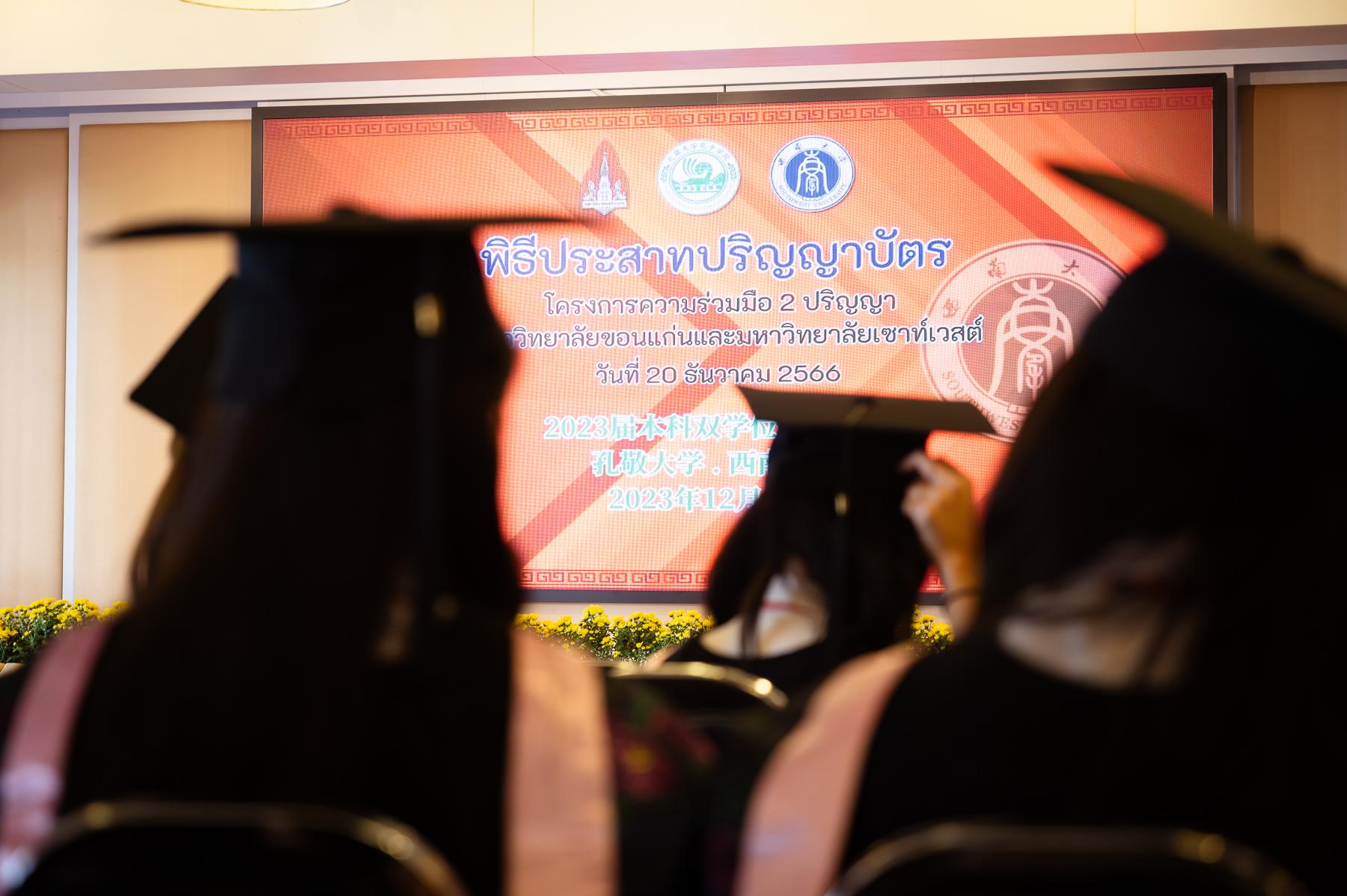 เมื่อวันที่ 20 ธันวาคม 2566 มหาวิทยาลัยขอนแก่น จัดพิธีประสาทปริญญาบัตรของ มหาวิทยาลัยเซาท์เวสต์ โดยมี รศ.นพ.ชาญชัย พานทองวิริยะกุล อธิการบดีมหาวิทยาลัยขอนแก่น เป็นประธานในพิธีและเป็นผู้ประสาทปริญญาฯ ทั้งนี้มี รศ.ดร.อิศรา ก้านจักร คณบดีคณะศึกษาศาสตร์ และ รศ.ดร.อรทัย เพียยุระ คณบดีคณะมนุษยศาสตร์และสังคมศาสตร์ อ่านรายนามผู้สำเร็จการศึกษา โดยในปี 2566 มีผู้สำเร็จการศึกษาจากทั้ง 2 มหาวิทยาลัย จาก สาขาวิชาการสอนภาษาจีนในฐานะภาษาต่างประเทศ คณะศึกษาศาสตร์ และ วิชาเอกภาษาจีน คณะมนุษยศาสตร์และสังคมศาสตร์ จำนวน 32 คน หลักสูตร 2 ปริญญา เป็นความร่วมมือระหว่างมหาวิทยาลัยขอนแก่น และ มหาวิทยาลัยเซาท์เวสต์ โดยมีสถาบันขงจื่อ มหาวิทยาลัยขอนแก่น เป็นผู้ประสานงาน มีจุดเริ่มต้นจากการที่สองมหาวิทยาลัย มีวัตถุประสงค์ที่สอดคล้องกัน คือ ต้องการผลิตบัณฑิตที่มีความสามารถทั้งทางด้านภาษา และ วัฒนธรรมไทย-จีน ซึ่งการที่จะเรียนรู้ได้เป็นอย่างดีนั้น ต้องเปิดโอกาสให้นักศึกษาได้ไปเรียนรู้ ณ ประเทศเจ้าของภาษา จึงทำให้เกิดเป็นหลักสูตรความร่วมมือทั้งสองหลักสูตร ซึ่งจะที่ศึกษา ณ มหาวิทยาลัยขอนแก่นก่อนต่อจากนั้นนักศึกษาจากทั้งสองคณะจะไปศึกษาต่อที่วิทยาลัยนานาชาติ และ คณะอักษรศาสตร์ มหาวิทยาลัยเซาท์เวสต์ เป็นระยะเวลา 2 ปี ก็จะสำเร็จการศึกษาจากทั้ง มหาวิทยาลัยขอนแก่นและมหาวิทยาลัยเซาท์เวสต์